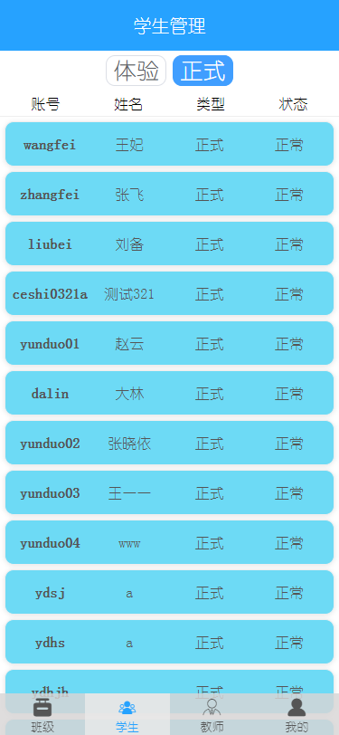 ”學(xué)生“:可以查看正式的和體驗(yàn)的學(xué)生賬號(hào)有哪些,點(diǎn)擊對(duì)應(yīng)的學(xué)生可以查看學(xué)生的相關(guān)信息,點(diǎn)擊對(duì)應(yīng)的測(cè)試、記錄和作業(yè)可以查看對(duì)應(yīng)學(xué)生的相關(guān)信息,和班級(jí)詳情里展示的信息一樣。